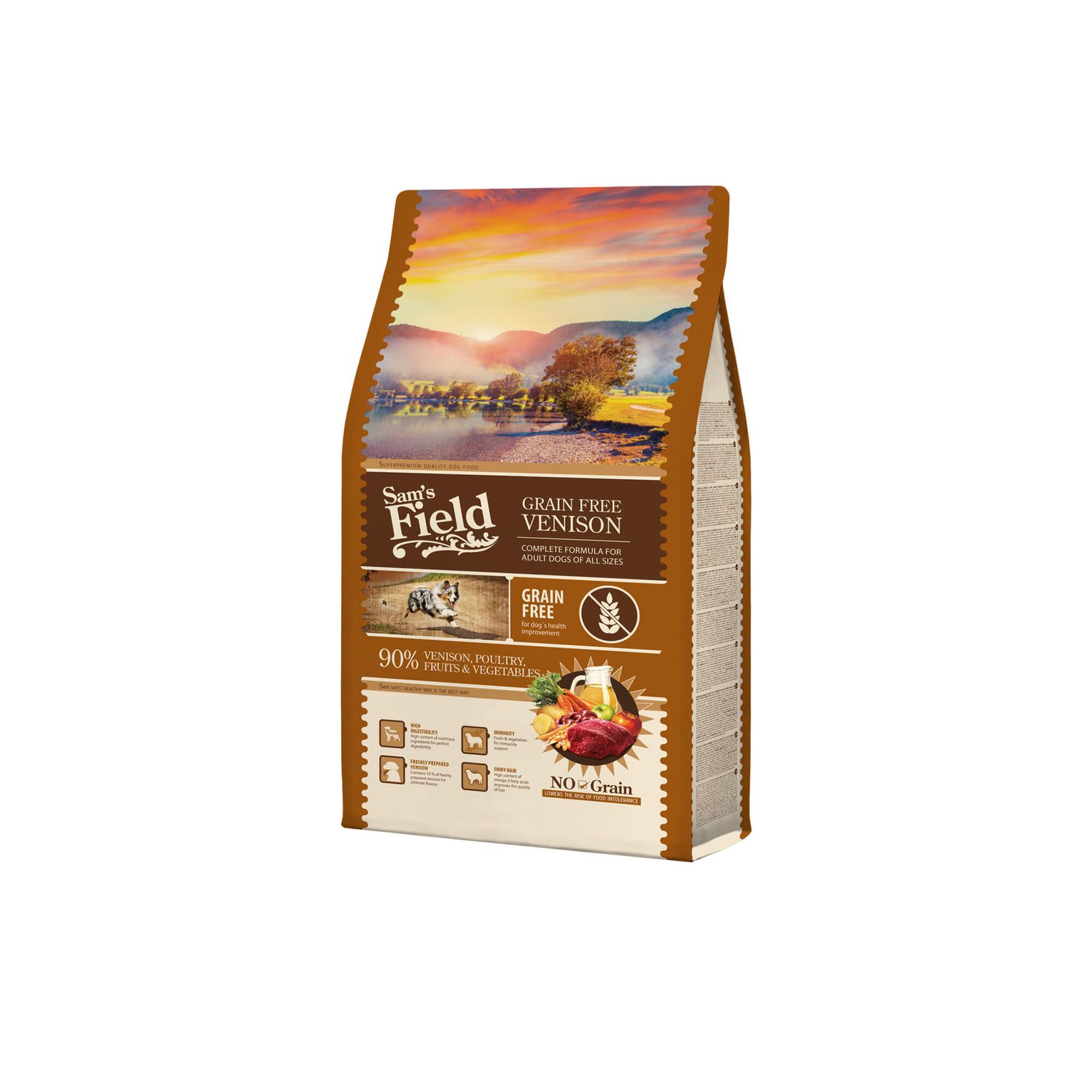 SAM´S FIELD™ Adult Grain Free s Divljači Potpuna suha hrana za odrasle pse svih pasmina. Preventivna formula za cijeli život=kombinacija mesa, voća i povrća za zdravlje vašeg psa. Bez žitarica / 90% Jelen, perad, voće i povrće. UPUTE ZA HRANJENJE : hranite suhom ili djelomično navlaženom hranom. Svježa voda uvijek mora biti dostupna. Dnevne hranidbene potrebe vašeg psa se mogu razlikovati zbog okoline gdje boravi, veličini, starosti i fizičkom opterećenju. Da bi održali pravilnu kondiciju, osigurajte da vaš pas ima dovoljno fizičke aktivnosti i da ga ne hranite previše. Čuvati od vlage; na suhom, tamnom i hladnom mjestu. Najbolje upotrijebiti do, tablica hranjenja, serijski broj i neto masa: otisnuti su na pakiranju.